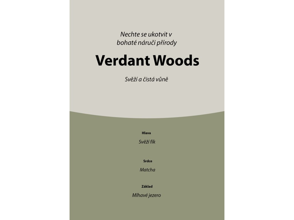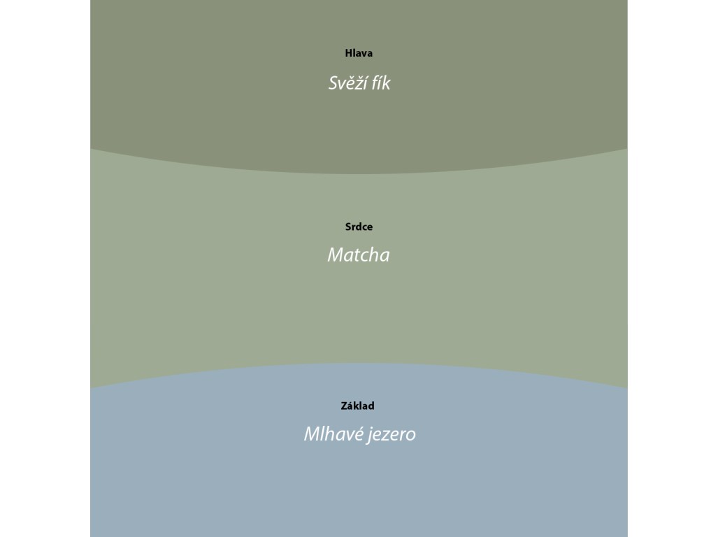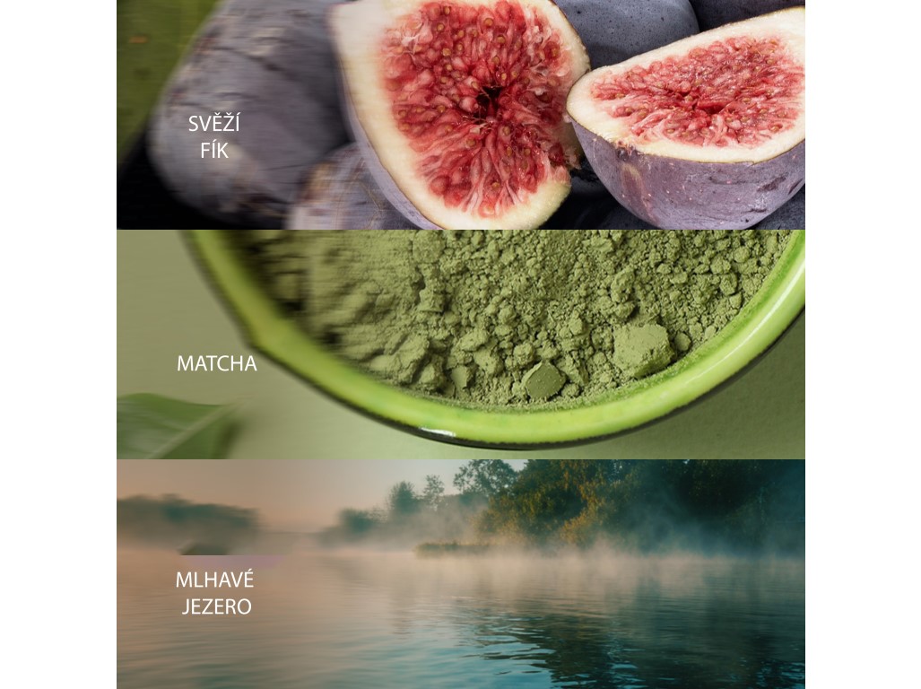 Három illat, három természetközeli pillanat: lédús füge cédrusfával, citrusos–fűszeres matcha-szív, majd friss tóparti pára. A rétegek fokozatosan bontakoznak ki, nyugalmat, frissességet és természetes eleganciát hozva.