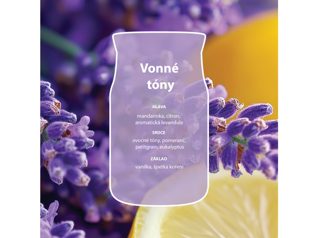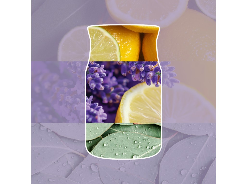 A friss citrom és a megnyugtató levendula harmonikus, üde illattal tölti meg a teret. Az utántöltő nyugalmat, frissességet és elegáns otthoni hangulatot ad.